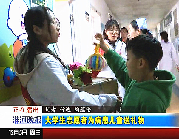 活动初期,全体青协人员通过自己积极动手、面向全校学生征集和校外活动中社区儿童们的现场学习制作等形式,共筛选汇集了200余件品类不一的手工礼品。随后,利用周末时间,青协志愿者带着冬日里暖暖的爱意,在医护人员的引导下分组来到一附院儿科病房,将一件件精美的礼品送到患儿或家长手上,并献上了温馨的祝福之语和浓浓的关爱之情。在收到礼物的瞬间,看到患儿们脸上洋溢出的幸福表情,志愿者们的内心也有着一股莫大的欣慰与感动。活动得到了广大患儿及家长、一附院儿科医护人员的高度好评,蚌埠电视台淮河晚报栏目对此进行了专题采访报道。