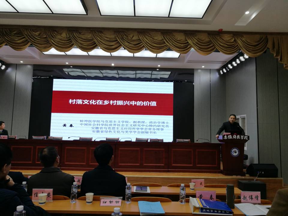 会议以“回眸农村改革 助推乡村振兴”为主题展开学术交流,驻蚌高校专家学者、蚌埠市有关农业领域政府职能部门和企业家代表作主题发言。我校马克思主义学院副教授黄春在会上作了《村落文化在乡村振兴中的价值》的主旨发言。发言围绕村落是中国传统文化的主要发源地,村落文化是乡村共同体内的一个精神家园,村落文化是乡村振兴的灵魂等方面作了深刻阐释,得到与会专家学者的共鸣。