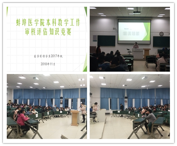 为了更好地迎接学校本科教学审核评估工作,使学生们更加了解评估、熟悉评估,提高学生在评估工作中“人人有责”的责任意识,11月21日下午,医学影像学系2017年级在T4教室举办以“学习评估知识,决战蚌医之巅”为主题的知识竞赛。