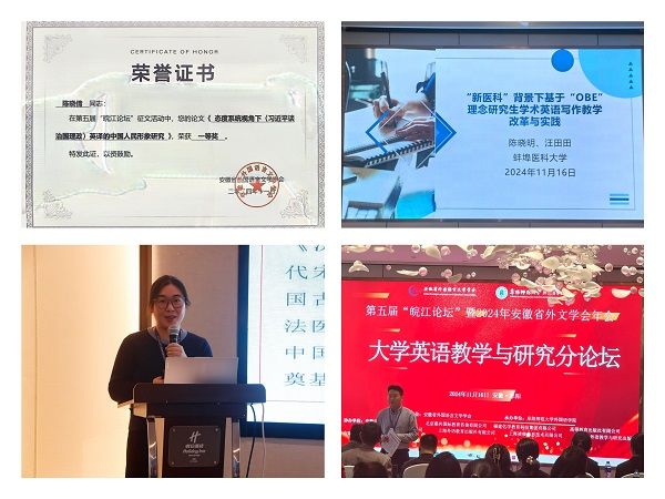 11月15日至17日,第五届“皖江论坛”暨2024年安徽省外国语言文学学会年会在阜阳师范大学举办,来自全省各高校外语教学负责人、专家学者近300人参加了会议。公共基础学院外文教研室教师2位教师在分论坛做主题汇报,1位教师主持分论坛并做大会汇报,1位教师论文荣获论文评比一等奖。