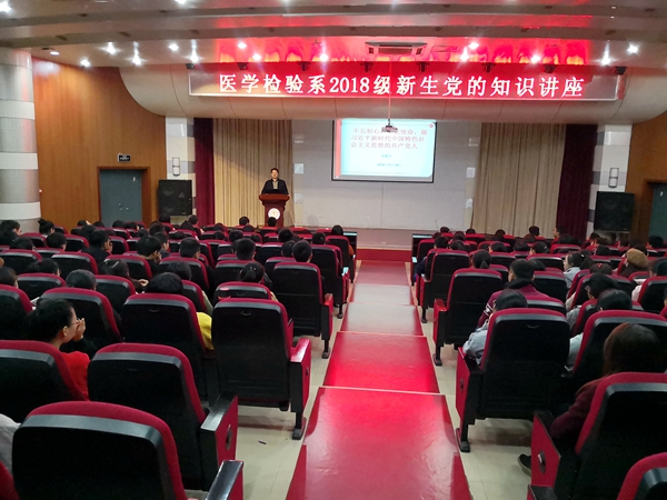 为了进一步增强新生理想信念教育,引导新生了解党的基本理论知识和入党程序,帮助新生树立坚定马克思主义和共产主义信念,11月16日,医学检验系在学术报告厅开展2018级新生党的基本知识教育讲座,党总支书记荣梅生主讲,年级辅导员和2018级全体新生参加。