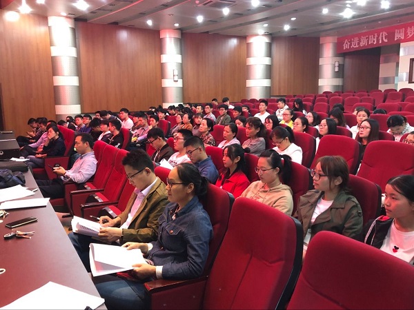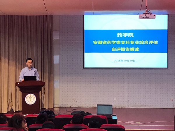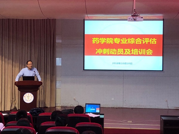 为迎接安徽省本科高校药学类专业综合评估,2018年10月10日下午,药学院在学校学术报告厅(大)召开药学专业综合评估冲刺动员及培训会,药学院党总支书记于伟荣、院长刘浩、院长助理霍强、各教研室主任、实验中心负责人、药学院全体教师、一二附院药剂科教师、药学和药物分析学专业参加座谈会学生及全体研究生参会。