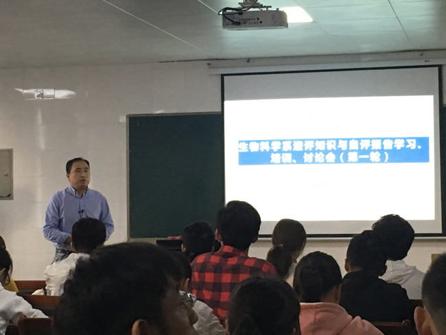 为迎接本科教学审核评估,全面落实审核评估各项准备工作,根据校迎评工作整体安排和本系工作计划,生物科学系于10月11日下午,组织召开了迎评知识与自评报告第一轮学习、培训会。系全体教师和各年级学生代表参加了学习培训会。