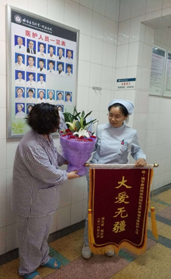 前后四次手术,没有亲人在身边,全麻手术后生活不能自理,这样的情况集中到一位病人身上,就足以引起重视了。周女士说道,自从住进这个病区后,护士长刘春芳每天上班总是第一个到病房来看她,关心地询问病情,特别是一发现周女士的情绪有波动,就陪着她跟她聊天,把周女士思想上的疑问给解决,同时在护理上无微不至地关怀,比如扶周女士上厕所、为周女士换衣服、擦拭等。周女士感慨到,在中德乳腺病病区住院的一个多月时间里,刘护士长已经形成了习惯,每天上班到病房问候,每天下班后到病房进行交流、沟通,这几乎已经成了她的习惯。“后来我了解到护士长也很不容易,上班忙碌无暇顾及自己,下班后忙家里的第二个孩子,孩子才一岁。”周女士表示,她一直很感动刘护士长放弃陪孩子的时间来陪她,使她能够释然地去接受皮瓣地坏死,积极配合治疗。还有病房的责任护士芮文科,总是不声不响地把所有工作都做在前面,比如及时搀扶周女士上厕所,为周女士换衣服、擦拭等,给周女士在打针和护理上带来安全感。