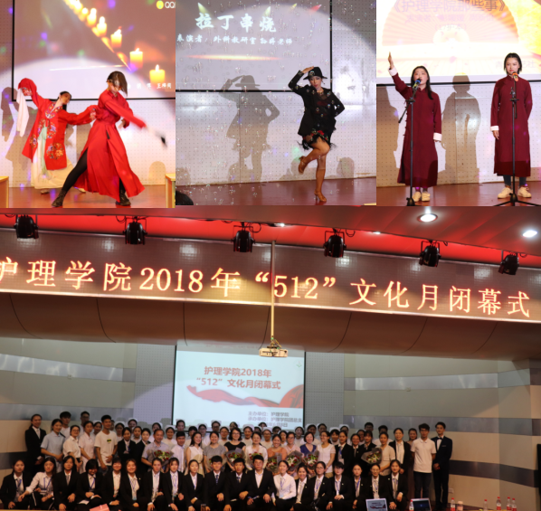 文化月闭幕式以《护理学院33年历程》拉开序幕,建院以来的三十届毕业生老照片把大家带入了护理学院往昔的发展岁月,全体师生共同感受了护理学院的变迁与发展,倍感亲切与自豪。在毕业生中有全国优秀护理部主任、省五一劳动奖章获得者、省教坛新秀、省市道德模范,优秀护理骨干……,她们忙碌在各级医疗卫生机构中,从事临床护理、护理教育、护理管理工作,为护理事业发挥着光和热。她们发来的庆祝母校60周年的祝福视频饱含着对母校和护理学院的深情和眷恋,深深地感染着我们每一个人。护理学院师生们编排的《护士服秀》为大家展示了护士服的变迁;外护教研室孙老师的《拉丁串烧》舞蹈传递着老师们对艺术和生活的热爱;毕业生代表们走上台来,奉上一束束鲜花表达了对老师们多年辛勤培育的感谢;在晚会即将结束的时刻,全体师生共同唱起《护士之歌》将晚会推向高潮,也为本次“5·12”文化月系列活动画上了圆满的句号。