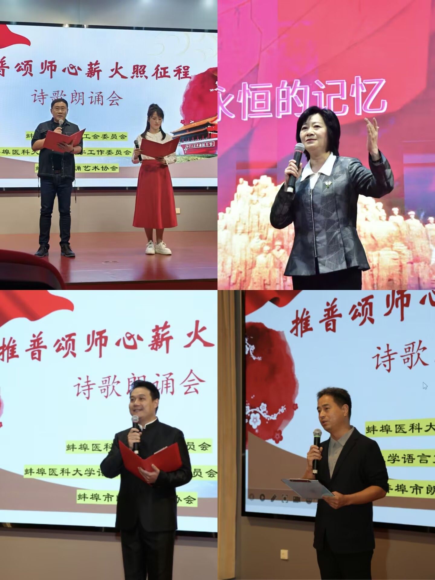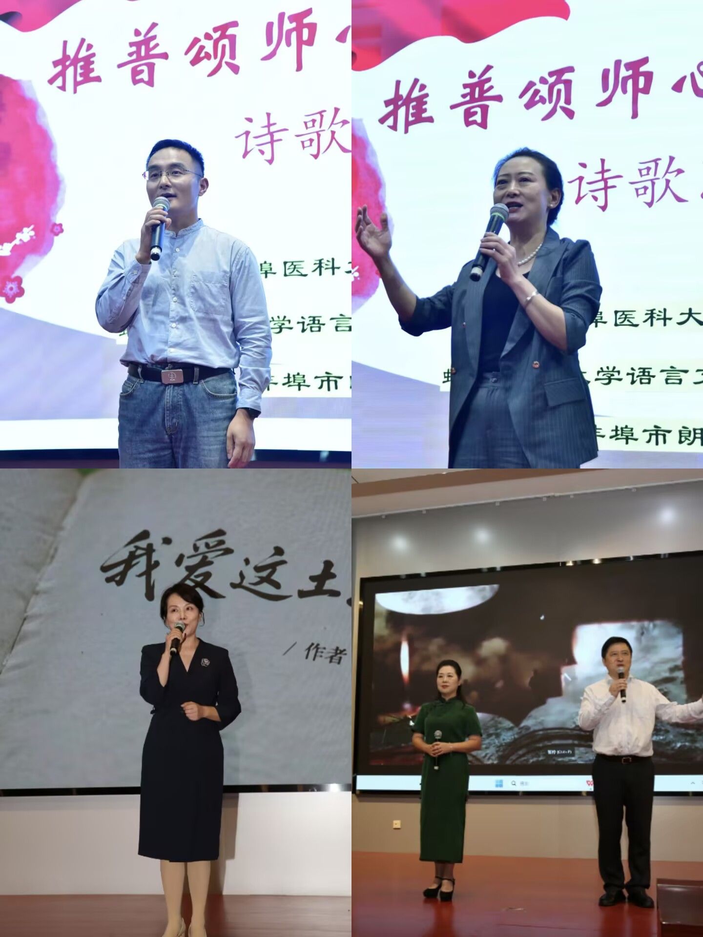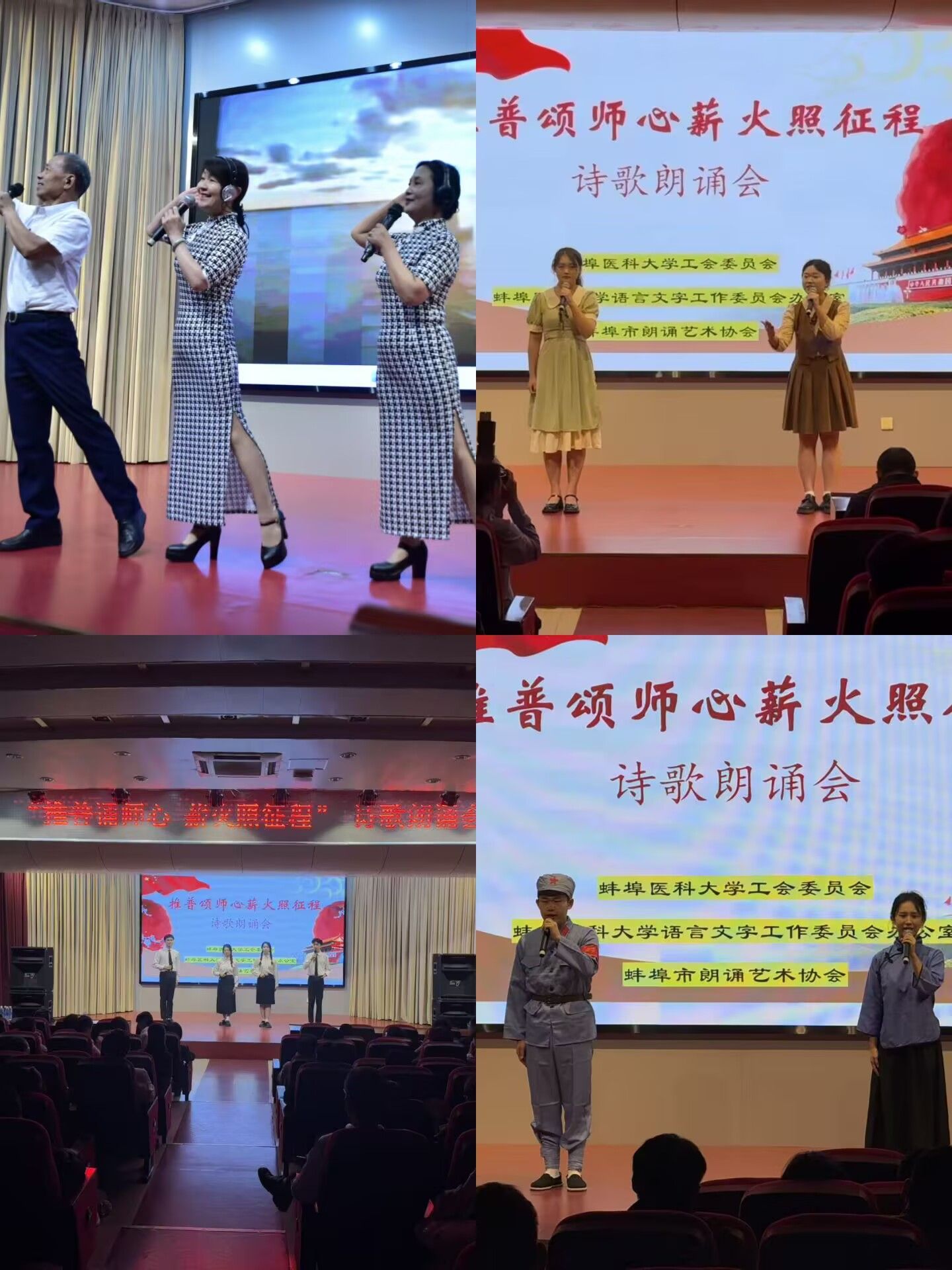 在第28届全国推广普通话宣传周之际,为深入推广国家通用语言文字,传承师者初心,凝聚奋进力量,9月19日晚,由校工会、校语言文字委员会办公室和蚌埠市朗诵艺术协会共同举办的“推普诵师心 薪火照征程”诗歌朗诵会在我校举办。整场活动以朗诵为载体,将语言之美与教育情怀、家国担当深度融合,为师生呈现了一场兼具思想性与艺术性的文化盛宴。