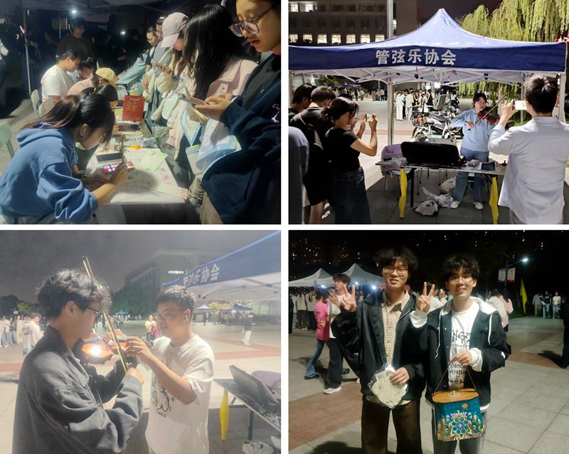 活动现场,师生相聚湖畔,手持“中秋集章单”,开启沉浸式打卡之旅。湖畔沿线,各社团展位亮点纷呈。管弦乐协会的一位成员以优雅的小提琴将中秋的浪漫氛围烘托得恰到好处,引得周围同学纷纷驻足;书画协会则现场书写中秋祝福书签,社员伏案挥毫,“月满中秋”“万事顺遂”等笔墨饱满的祝福跃然纸上,台前排起了蜿蜒的长队,拿到专属书签的同学脸上都漾着藏不住的笑意;社联的“你做我猜”和“猜灯谜”游戏更是排起长队,有人对着谜面轻声讨论,有人灵光一闪喊出答案时,周围立刻响起阵阵喝彩。大家驻足思索、欢声笑语不断,将热闹氛围推向高潮。师生们手持集章单穿梭于各个摊位,在游戏互动中收集印章,也感受着不同社团的独特魅力。