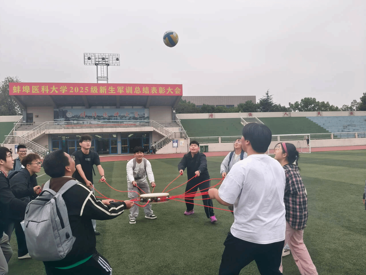 随后进行的“打鼓击球”活动则将现场气氛推向高潮。每组队员需要共同牵拉一个拴着数根绳子的同心鼓,通过协同发力让鼓面击起排球。从最初的东倒西歪、球落满地,到后来的步调一致、连续击打,同学们在一次次尝试中学会了倾听、配合与包容。当鼓面“砰”地一声将球稳稳击向空中,伴随而来的是全队成员激动的欢呼,团队凝聚力的火花在此刻璀璨绽放。