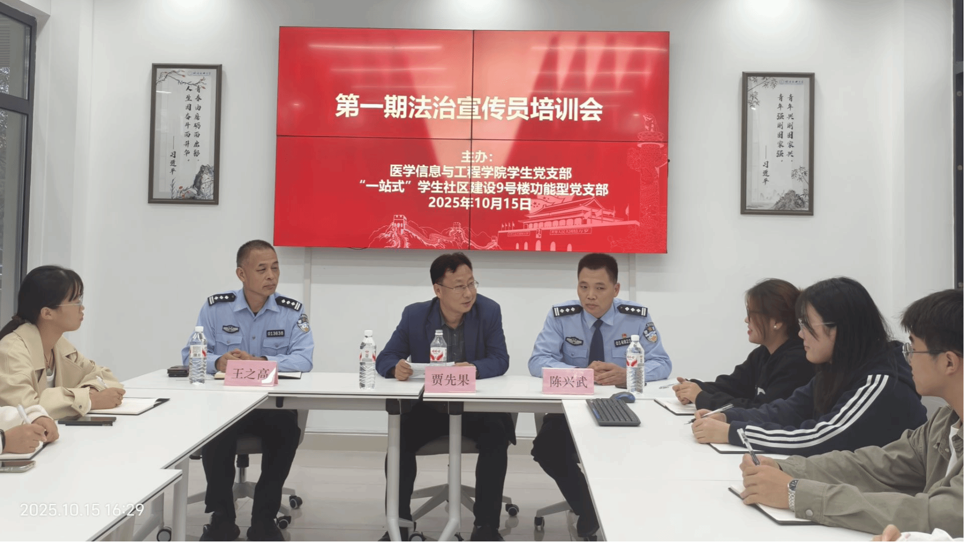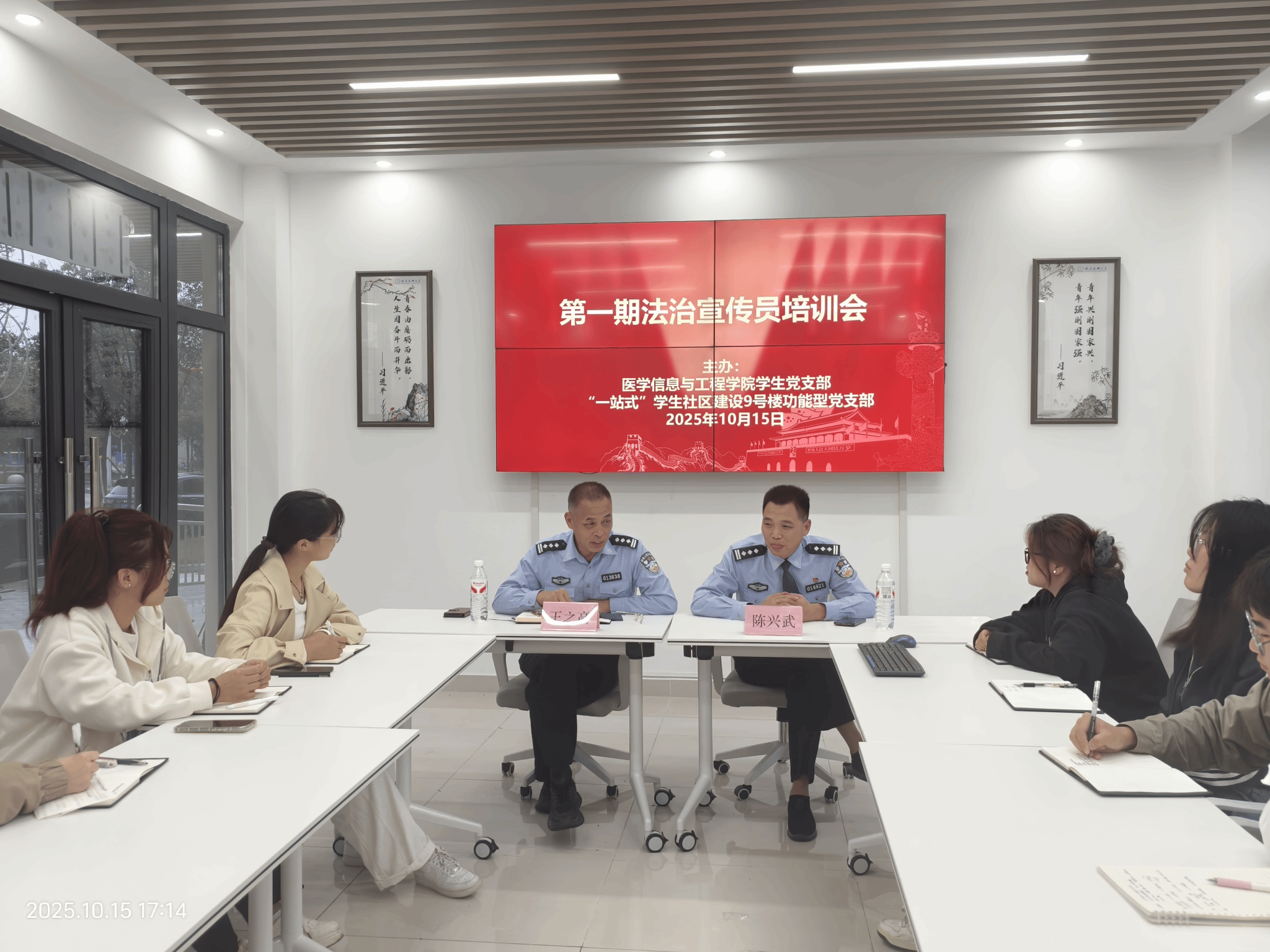 10月15日,医学信息与工程学院学生党支部联合学生公寓9号楼功能型党支部在“一站式”学生社区综合活动室举办第一期法治宣传员培训活动。学院党委副书记贾先果、法治导师陈兴武、法治辅导员王之高、辅导员王俊及首批法治宣传员参加了此次活动。