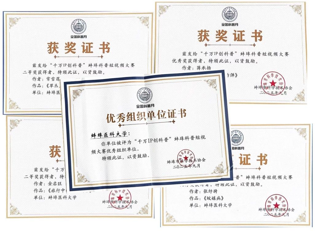 由蚌埠市科学技术协会主办的2025年“千万IP创科普”短视频大赛近日公布评选结果,基础医学院人体寄生虫学教研室选送的四部原创作品从全市300余件参赛作品中脱颖而出,喜获二等奖3项、优秀奖1项,并为学校赢得“优秀组织奖”荣誉,充分展现了学院在医学科普领域的创新实力。