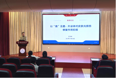 王玉帅作题为《以“微”见著:外泌体对皮肤光损伤修复作用初探》的学术报告,为在场师生带来了一场内容详实、见解独到的学术分享。报告中,他系统梳理并介绍了该领域的最新研究进展,层层深入、逻辑清晰。不仅加深了师生对外泌体相关研究的理解,更有力地激发了大家的科研兴趣与探索热情,有效促进了学术思想的交流与碰撞,获得一致好评。