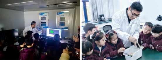 研学的第二站,师生们走进科研中心。在斑马鱼饲养实验室,孩子们被这群“科研小助手”吸引着围拢水箱观察;在科研平台,申林老师和王锐老师分别演示了斑马鱼荧光成像和小动物心脏超声。两位老师用童趣化讲解让抽象的科学知识变得直观易懂,激发了孩子们对生命科学的探索兴趣。孩子们踮脚围观、频频惊叹,抢着追问实验原理,抽象的科研知识在互动中变得生动可感,现场气氛热烈。