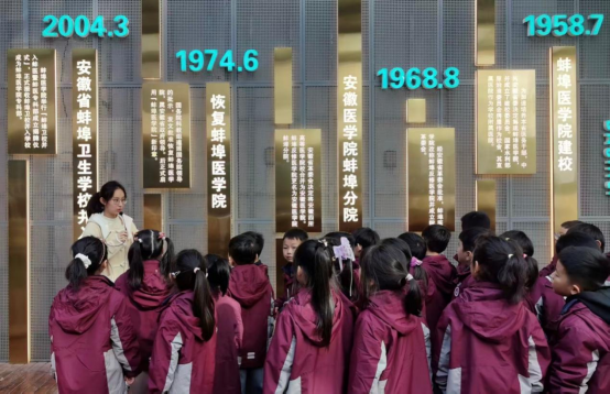 研学首站走进蚌埠医科大学校史馆。讲解员通过珍贵的老照片、陈列的科研成果和生动的校史故事,向孩子们讲述了学校在医学教育、科研创新领域的发展历程。孩子们认真聆听,踊跃提问,眼中满是对医学知识的好奇与向往,深刻感受到了医者仁心的精神传承。