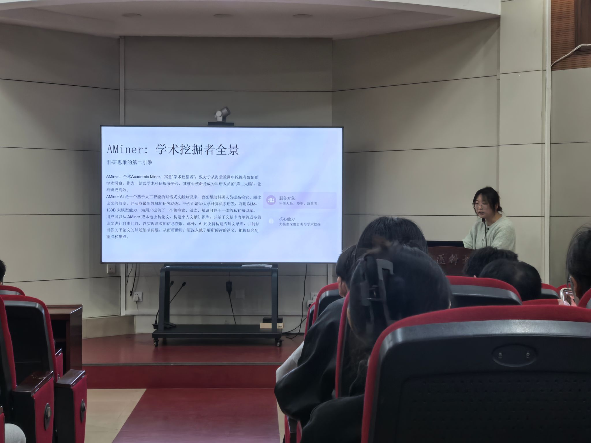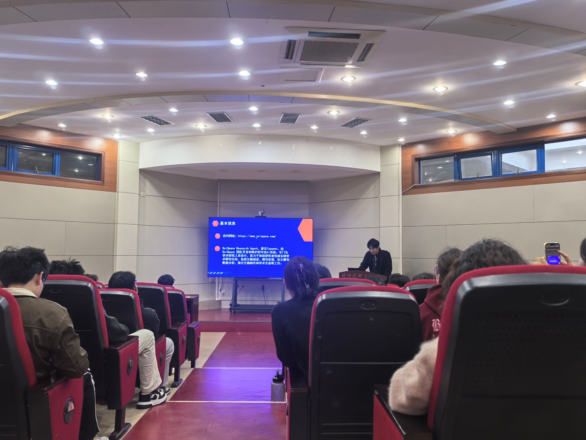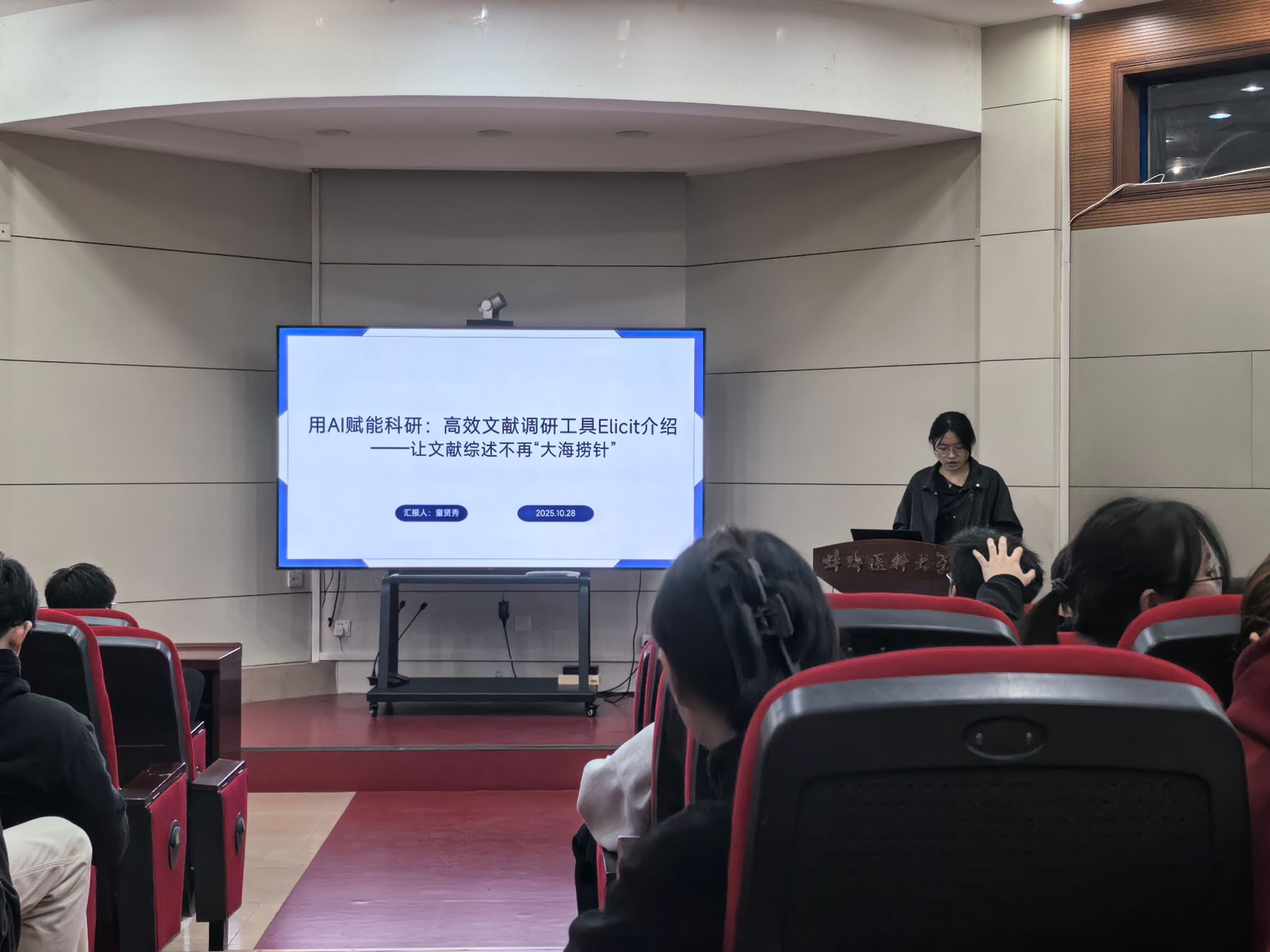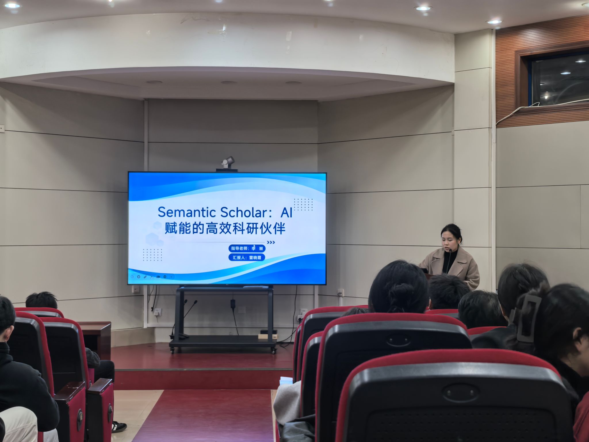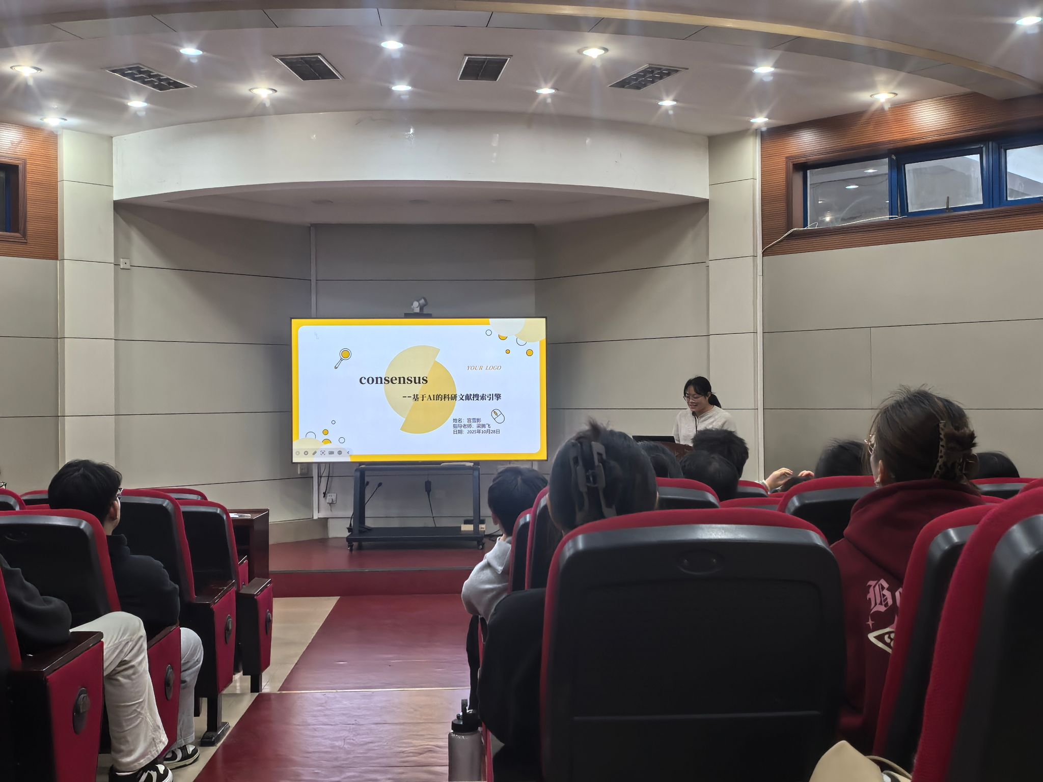 在交流分享环节,多位同学依次登台,介绍各类AI科研工具的实际应用:宫雪影同学以《Consensus:基于AI的科研文献搜索引擎》为题,重点讲解该工具在“精准检索”方面的优势;沈昊楠同学围绕《SCISPACE: AI增强型学术研究工具》展开,指出该平台能有效辅助完成各类学术任务,特别适合科研初学者使用;葛慧慧同学分享《Aminer: 科研全流程AI加速器》,强调其作为“学术挖掘者”在提升文献检索与阅读效率、追踪前沿动态方面的作用;童贤秀同学以《用AI赋能科研:高效文献调研工具Elicit介绍》为主题,通过现场演示展示Elicit的“问题驱动式检索”功能,可实现关键信息提取与对比分析,提升调研效率;雷晓霞同学则深入介绍《Semantic Scholar: AI赋能的高效科研伙伴》,结合使用经验说明其“智能推荐”功能在跟踪领域前沿成果方面的实用价值。