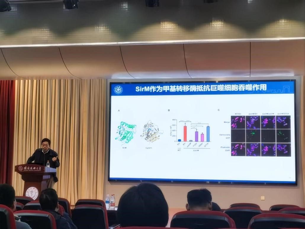 下午的学术讲座中,姚玉峰教授以“细菌来源血红素参与致病新机制”为题,聚焦临床科学问题,从课题来源、基因挖掘、表型分析与机制验证等方面递进式的展示了其课题组在沙门菌致病新机制中取得的最新研究进展。系统阐明了在与宿主互作过程中,肠杆菌科病原菌甲基转移酶SirM通过甲基化HemL促进细菌血红素合成,进而抑制巨噬细胞吞噬作用和促进巨噬细胞焦亡以增强病原菌的肠道竞争优势的致病新机制。讨论环节,姚玉峰教授对师生问题进行了详细的解答。