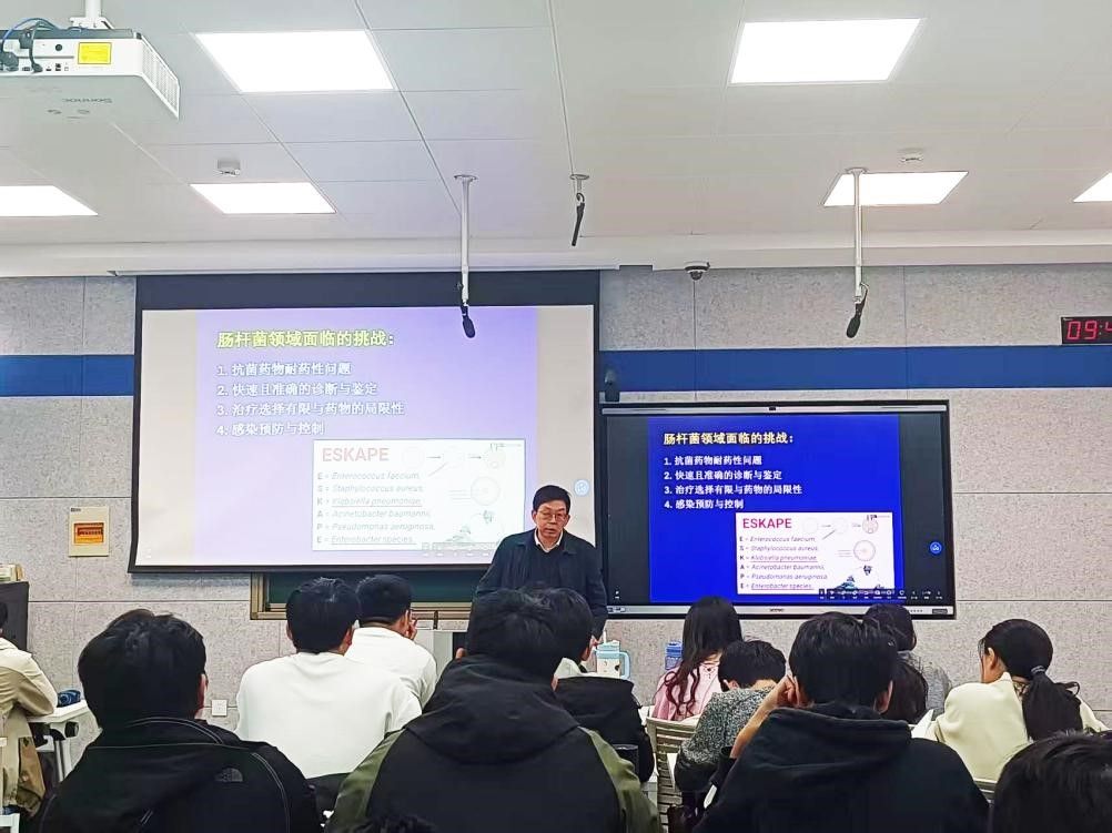 教学中,姚玉峰教授以生活场景自然引入肠杆菌科新课内容,展开肠杆菌科致病菌的“三性一防一治一检查”的讲解。授课内容基于课本却不局限于课本,有机融合临床案例解析,促进学生对基础知识的掌握与临床思维的培养;适时结合科学前沿进展,提升课堂趣味性与学生的科创热情。整个授课过程气氛活跃、教学效果显著。