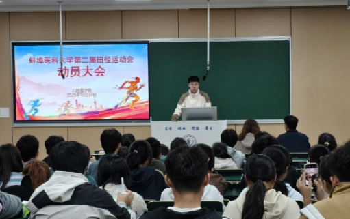 为激发运动员斗志、凝聚集体力量,顺利完成运动会参赛任务。10月27日,口腔医学院在理论楼204召开了蚌埠医科大学第二届田径运动会动员大会。学院党委书记孙文兵出席会议,年级老师左若雨、金齐德、邱若兰、赵梦丽、全体运动员以及学生会青协同学参会动员大会。
