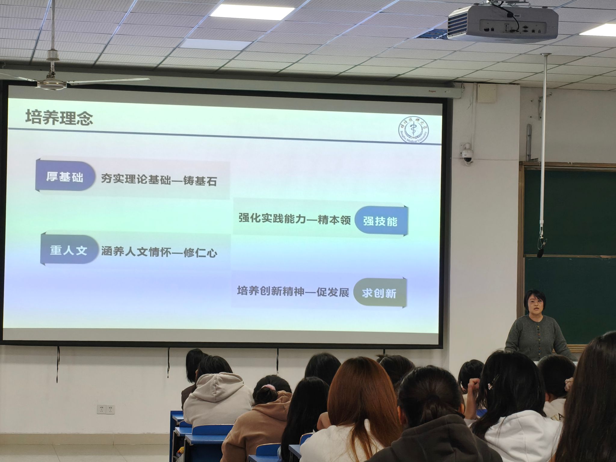 护理学院教学办王洁老师围绕“厚基础、强技能、重人文、求创新”的培养理念,系统介绍了护理学与助产学专业的课程体系、学分要求及临床实践安排。她特别指出,助产学专业作为学院申请设立的新兴专业,人才缺口大、就业前景广阔,鼓励新生主动学习、深刻领会专业精神,为未来服务健康事业打下坚实基础。