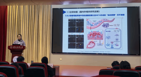 丁小雨博士围绕其预申报国自然课题“蜕膜巨噬细胞来源CDH2通过招募中性粒细胞并诱导NETs形成介导SLE患者妊娠异常的机制研究”进行了汇报。通过临床样本分析,结合组学测序和免疫荧光等先进技术揭示了CDH2在系统性红斑狼疮患者胎盘组织上调表达,并验证CDH2通过招募中性细胞和促进NETs产生,造成胎盘损伤最终导致妊娠异常的机制。她的报告逻辑清晰、数据翔实,从立项思路到实验设计,层层递进,展现了扎实的学术功底。