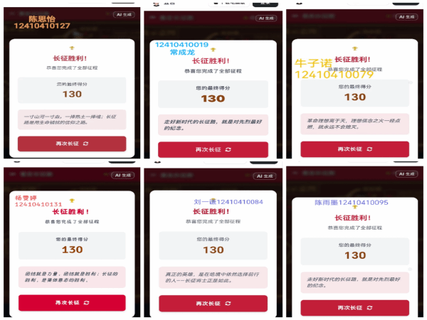 线上活动的AI互动环节成为传承红色文化的创新载体,以长征历程为蓝本,生动还原了突破湘江、四渡赤水、飞夺泸定桥等关键历史场景,同学们化身“长征战士”,在闯关答题中重温长征历史细节,在情景模拟中感悟革命先辈的坚韧意志。大家踊跃参与,纷纷截屏分享闯关成果,线上参与率达95%以上,形成了全员学习长征精神的良好氛围。