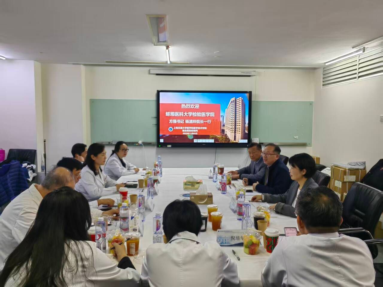 在上海交通大学医学院医学技术学院,检验医学院党政班子一行进行了交流学习。上海交通大学医学院医学技术学院学术委员会主任、原交大医学院副院长胡翊群,医学技术学院党委书记袁青,副院长王学锋及相关科室负责人出席座谈会,双方围绕党建共创、学科建设、科研创新、学生培养、人才引培等重点工作深入洽谈。