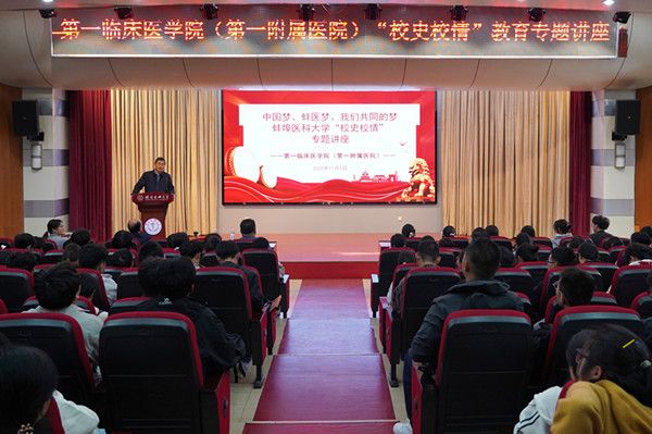 11月5日下午,第一临床医学院举办“中国梦、蚌医梦、我们共同的梦”蚌埠医科大学校史校情专题讲座,向新生普及校史校情知识,弘扬“艰苦创业、严谨治学、精诚为医、团结奉献”的蚌医精神。讲座特邀校关工委“五老”报告团高涌教授主讲,第一临床医学院本科生党总支书记陈卫东主持,年级辅导员及第一临床医学院2025级新生参加。