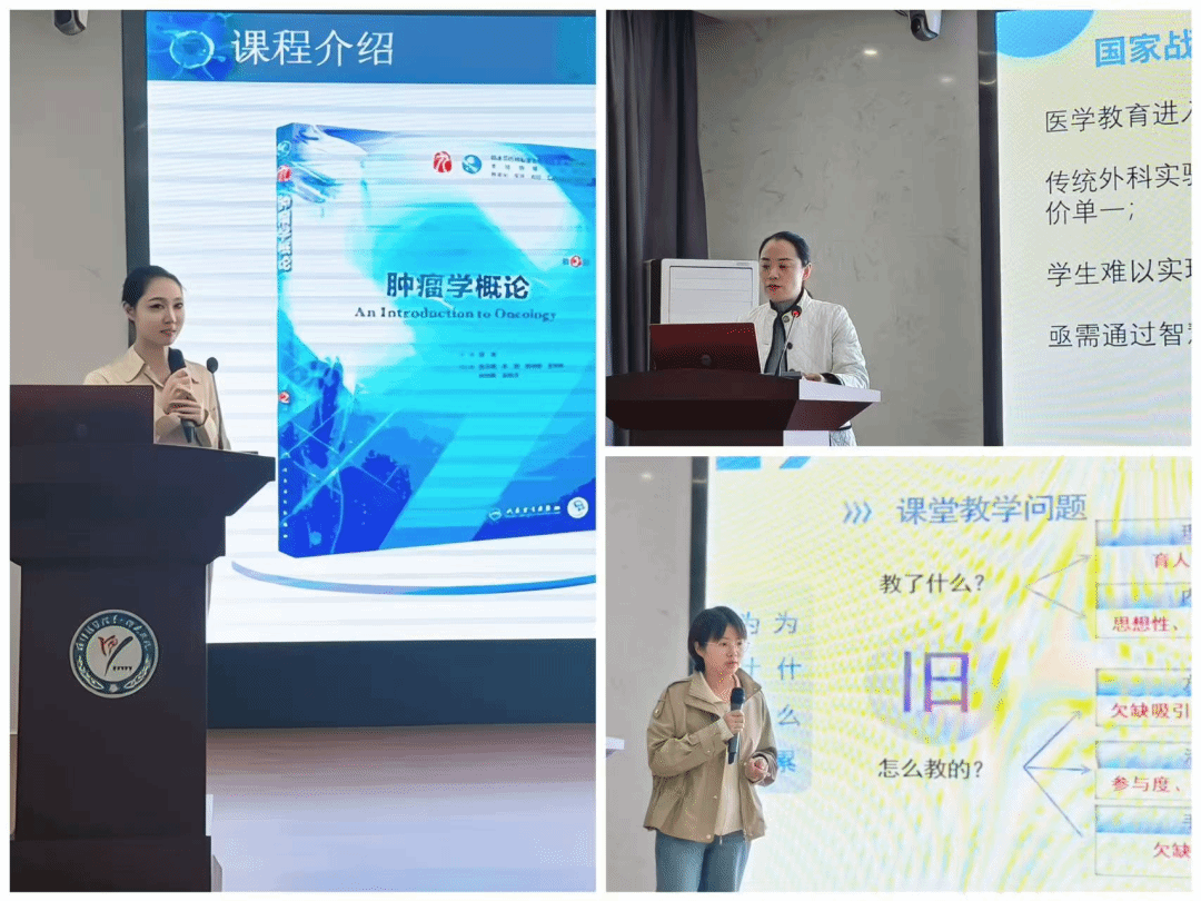 比赛现场,参赛教师紧扣临床教学实际痛点,通过多样化的创新手段,呈现了各具特色的课程教学创新方案。肿瘤学教研室赵梦蝶老师在《肿瘤学概论》课程中,构建了“理论筑基+虚拟仿真+技能实训”三维驱动的教学模式,实现从理论到临床实践的无缝衔接。外科学总论教研室陈芳芳老师创新引入《三体》科幻叙事,构建EPIC教学框架,借助“智子封锁”“面壁计划”等情境,将无菌原则、休克救治等知识点生动融入课堂。临床麻醉学教研室陈琴老师以“身体里的定时炸弹”——主动脉夹层案例为主线,在讲解麻醉前评估与危机处理的同时,有机融入了职业认同、责任担当等思政元素。中医学教研室程慧娟老师探索AI赋能中医问诊,通过虚拟病人模拟肿瘤营养评估,推动中西医诊疗思维实现跨界对话。