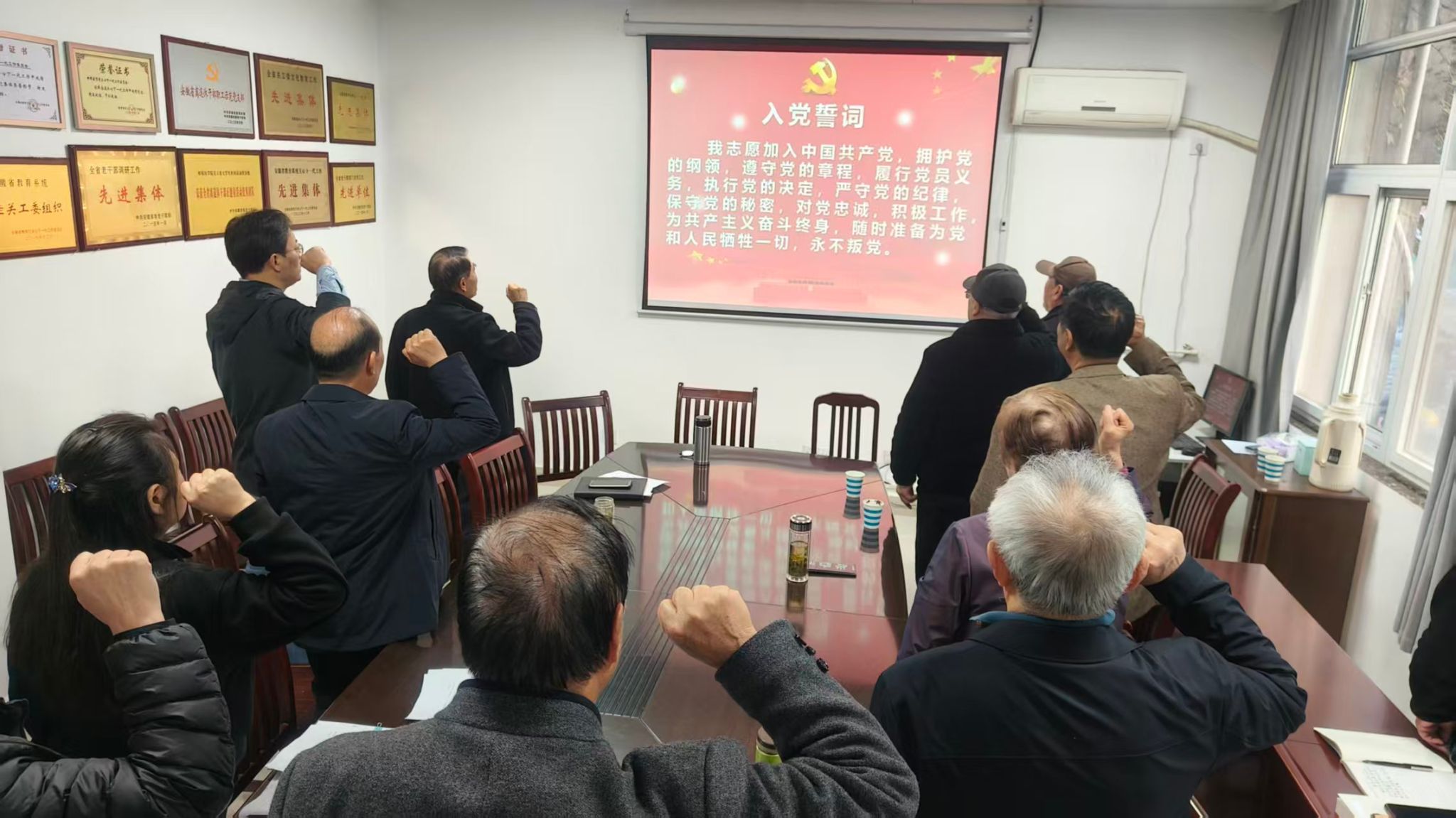 离退休教职工党总支委员、离退休处副处长李中文宣读11月份过“政治生日”的党员名单,离退休教职工党总支书记、离退休处处长麻利带领现场全体党员面向党旗肃立,举起右拳,重温入党誓词,铿锵誓言回荡其间,彰显着“离岗不离党、退休不褪色”的坚定信念。