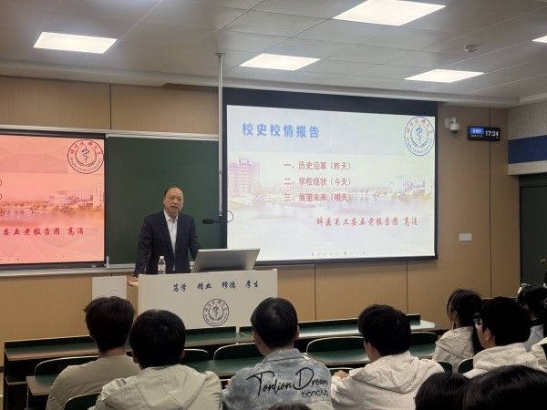 高教授从校史沿革、学校现状、办学理念、人才培养、科技创新等方面介绍了蚌埠医科大学的发展历程。从1958年淮河之畔的艰苦创业,到2023年升格为蚌埠医科大学的荣耀绽放,讲述了蚌医六十七载春秋流转,蚌医人用实际行动诠释着“精诚为医、团结奉献”的担当。高教授也勉励2025级新生们秉承“笃学、精业、修德、厚生”的校训,在医学教育的征程上勇毅前行,为守护人民健康、续写新的辉煌篇章。