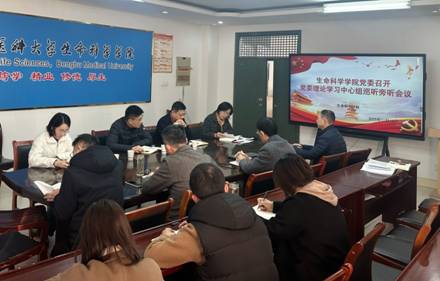 11月18日下午,生命科学学院党委召开理论学习中心组学习会议,学院党委委员、支部书记参加。校党委组织部副部长李礼、第二附属医院党委副书记吕宏杰到会巡听旁听指导。