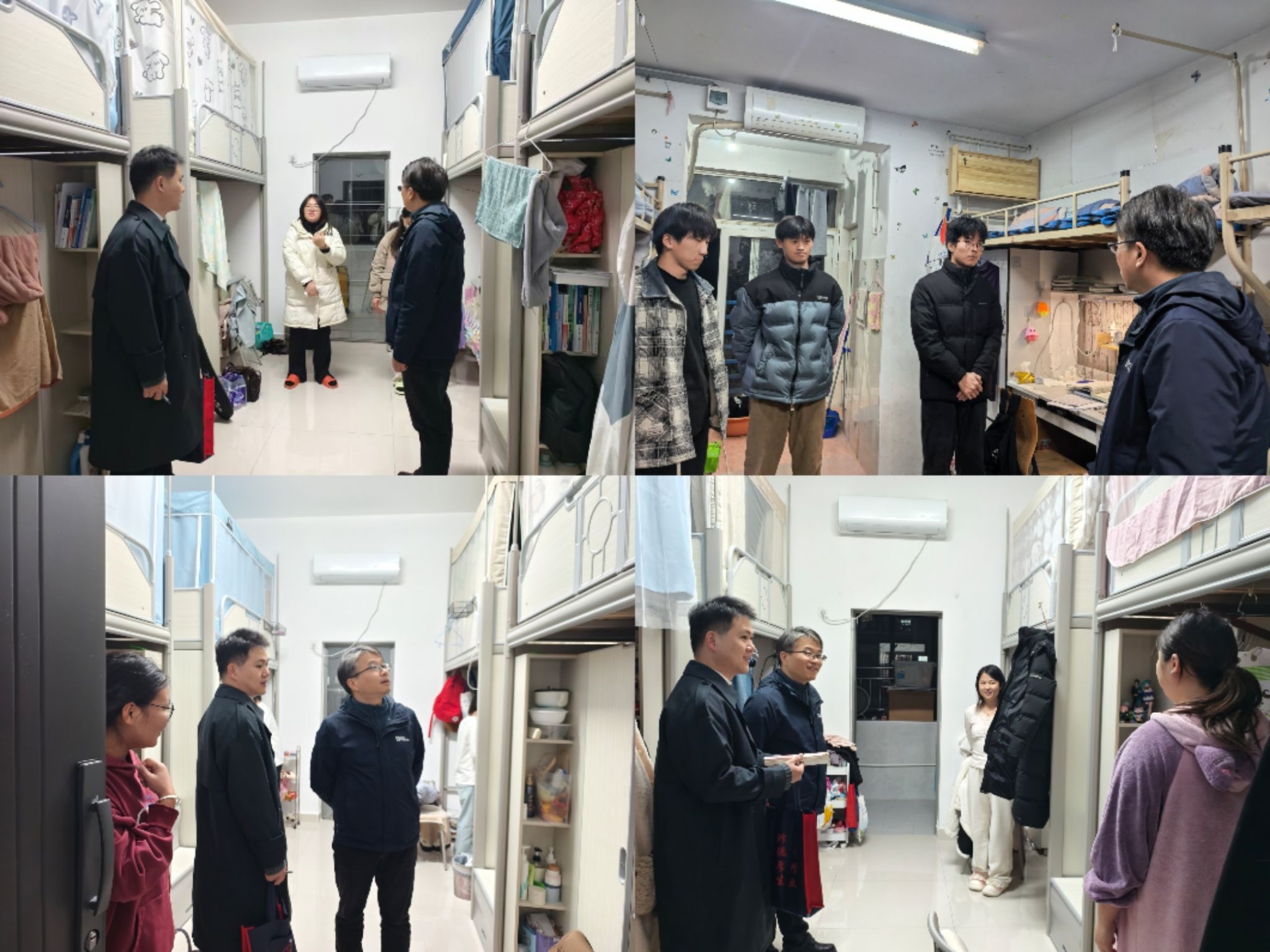 走访期间,老师们走进学生宿舍,在交流中细致询问生活与学习情况,并就防寒保暖、英语四六级及期末备考等事项给予温馨提示。对于环境卫生整洁、学习氛围浓厚的宿舍,当场予以表扬;鼓励大家保持优良学风,积极发挥榜样作用。