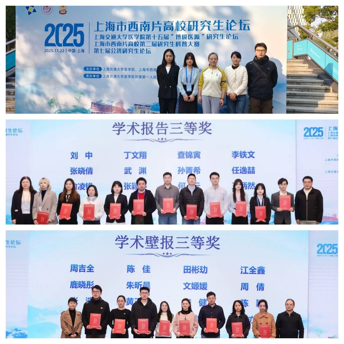 11月22日,上海市西南片区高校研究生论坛暨上海交通大学医学院第十五届“博极医源”研究生论坛、第七届公济研究生学术论坛在上海市第一人民医院举行。来自上海交通大学医学院、江南大学、蚌埠医科大学、遵义医科大学共计300余位师生参会。我校研究生共投稿32篇,经过现场评审,研究生何云获得学术报告三等奖,鹿晓彤获得学术壁报三等奖,张世晴、谢苗苗、杜崇利三位同学获得学术壁报优胜奖。