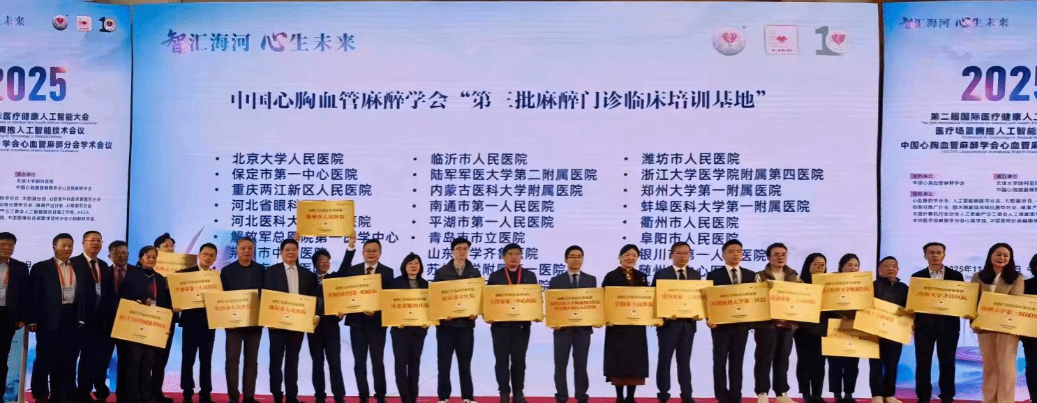 近日,在第二届国际医疗健康人工智能大会暨2025中国心胸血管麻醉学会心血管麻醉分会学术大会上,第一附属医院麻醉科被授予“规范化麻醉门诊培训基地”称号,全国共有23家医院入选。