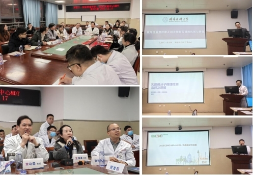 12月17日下午,药学院博士团队来到第一附属医院肿瘤外科。团队受邀参加了肿瘤外科的MDT多学科诊疗讨论会,深入临床实践场景。范方田教授分享了细胞代谢机制的相关研究。刘先富博士汇报了2025年ESMO HR+/HER2-乳腺癌研究进展。李祥博士介绍了乳腺癌分子病理检测选择及进展。随后,双方围绕化疗骨髓抑制的中医应用、纤维瘤的瘢痕问题、甲状腺炎发病机理等临床需求,进行了极具建设性的对话,特别探讨了如何将基础研究成果快速转化为可应用于手术期管理的新方法、新药物。