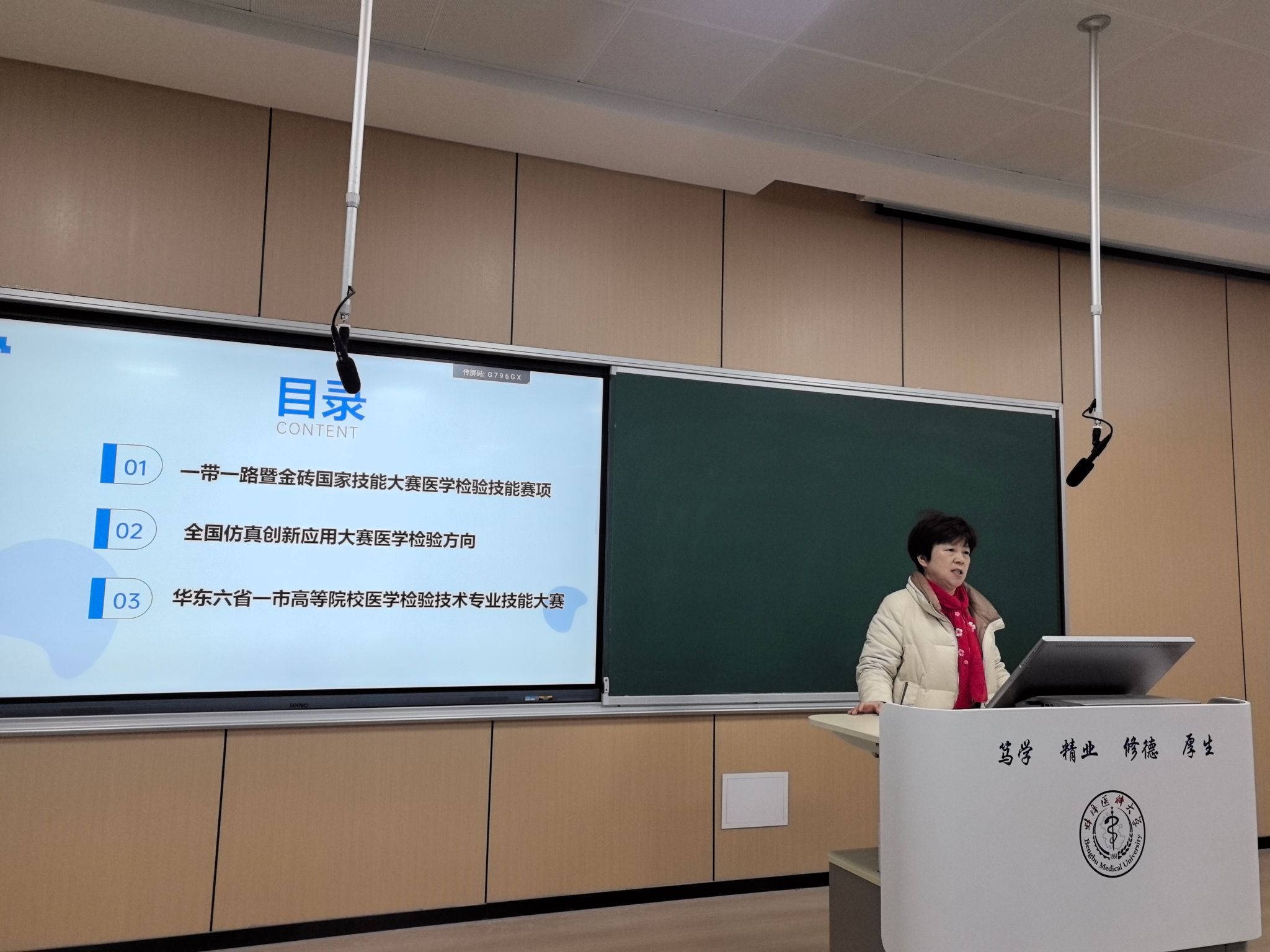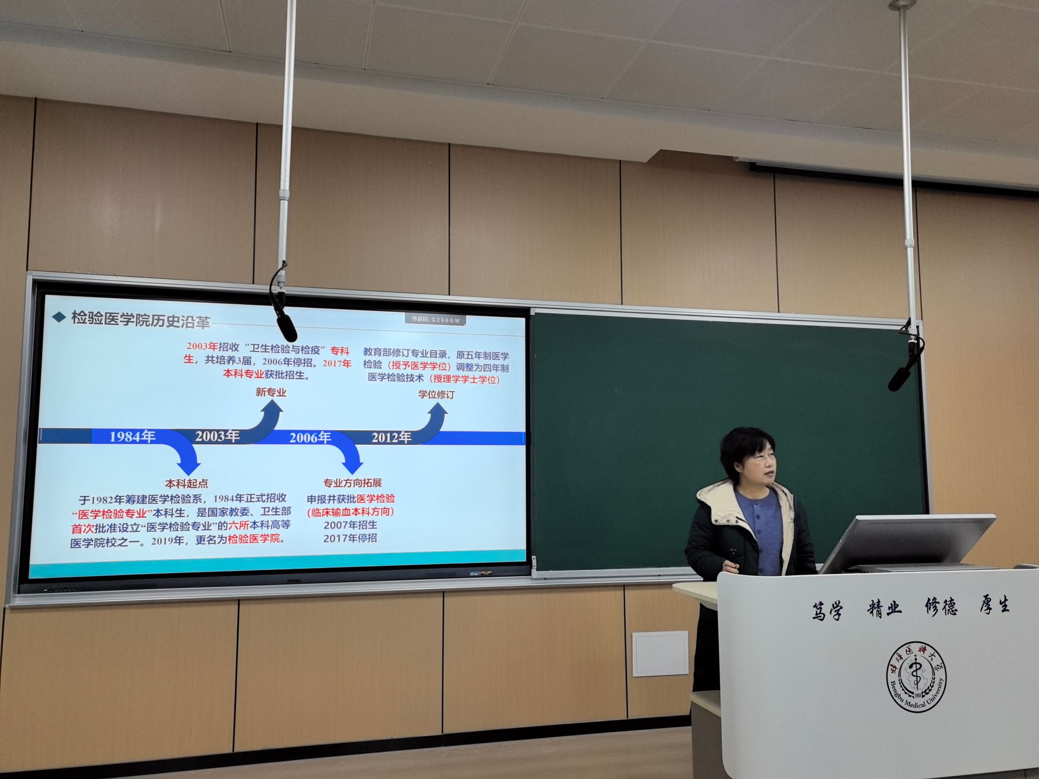 杨清玲教授以学院发展为脉络,从历史沿革、师资队伍、学科建设、学位点建设、科学研究、人才培养模式及学生发展等多个维度展开讲解。她系统梳理了学院的发展历程与办学成果,详细介绍了学院雄厚的师资力量与扎实的学科基础,深入阐释了特色人才培养模式,鼓励新生们珍惜学习机会,夯实专业基础,在检验医学领域找准定位、深耕细作。
