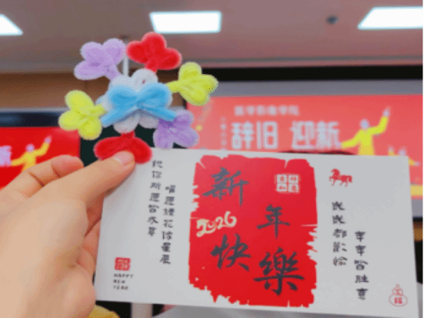 活动尾声,年级专门设置“祝福展示墙”,供同学们自愿展示贺卡、交流创作心得与新年的愿望。辅导员借此开展劳动教育微宣讲,指出制作扭扭棒摆件、亲手书写贺卡本身即是一次有意义的劳动实践,鼓励大家在日常生活中热爱劳动、投身劳动,在劳动中学会感恩、锤炼担当。本次活动以贺卡创作为纽带,将劳动教育、情感表达与迎新仪式有机融合,不仅锻炼了同学们的动手能力、表达能力和审美素养,更让大家深切体会到“劳动创造美好,真诚传递温暖”的内涵,进一步夯实了尊重劳动、乐于实践的思想基础。