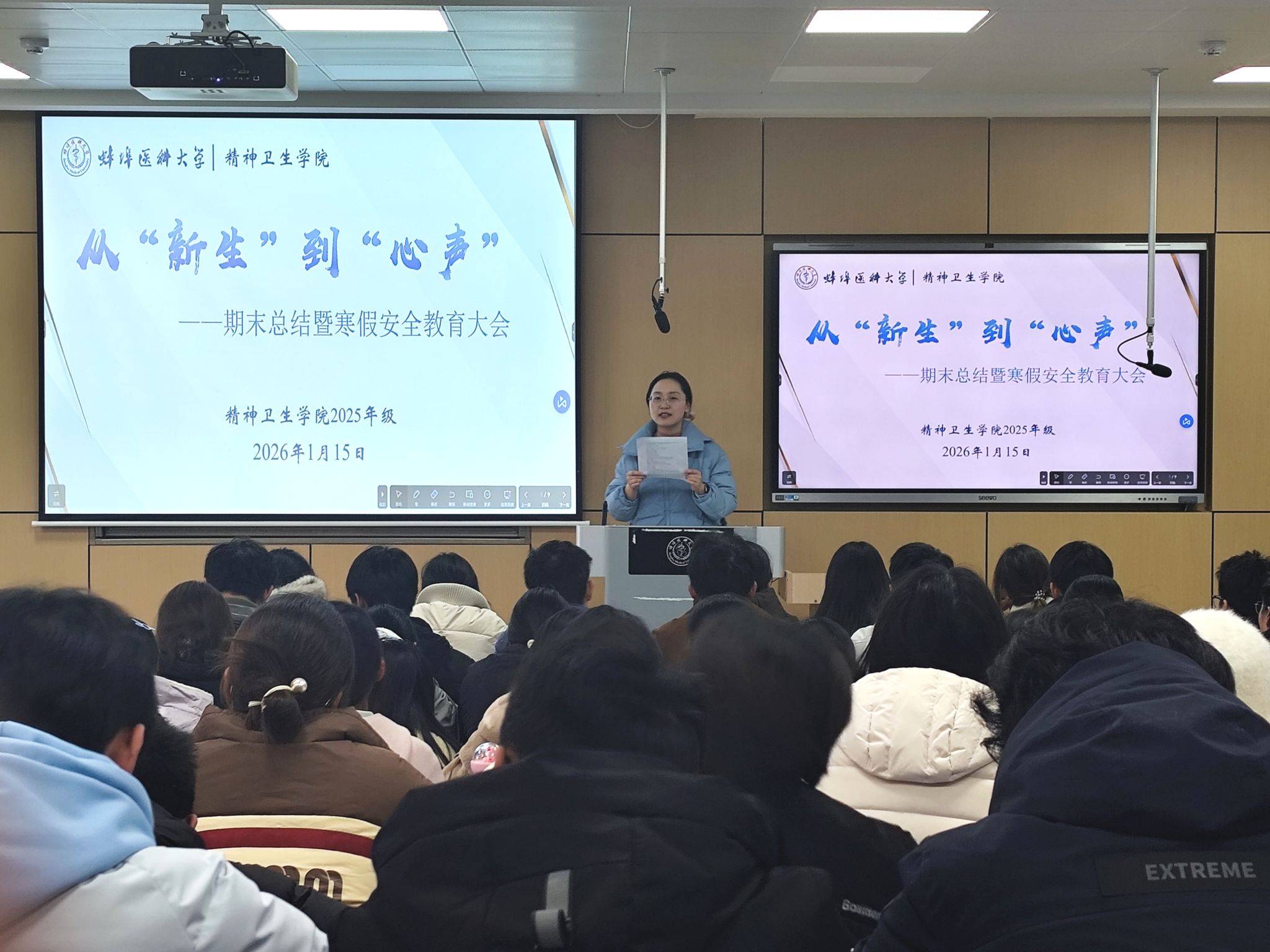 为系统总结学期工作成效,强化思政引领,筑牢安全防线,引导学生度过一个充实、平安、有意义的假期,1月15日下午,精神卫生学院面向2025级精神医学与应用心理学专业全体学生,组织召开了期末总结暨寒假安全教育年级大会。会议全面回顾了本学期年级在思想引导、学风建设、班级管理与学生成长等方面的工作,并对寒假安排进行了周密部署,充分展现了学院学生管理工作“管理育人、服务育人”的细致扎实与思想政治教育的引领高度。