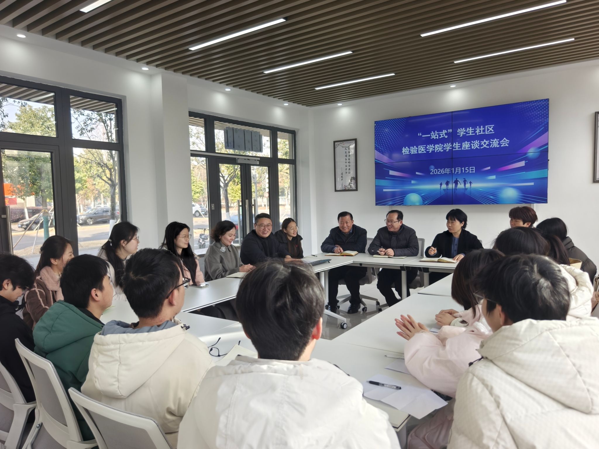 1月15日,检验医学院在一站式社区召开期末学生座谈会,学院党委书记方强、院长杨清玲、党委副书记梅传忠、副院长武文娟以及辅导员韩晓东、彭怡然老师与15名2023级、2024级的学生代表齐聚一堂,在座谈中深入了解学生学习生活需求,精准解决学生成长困惑。