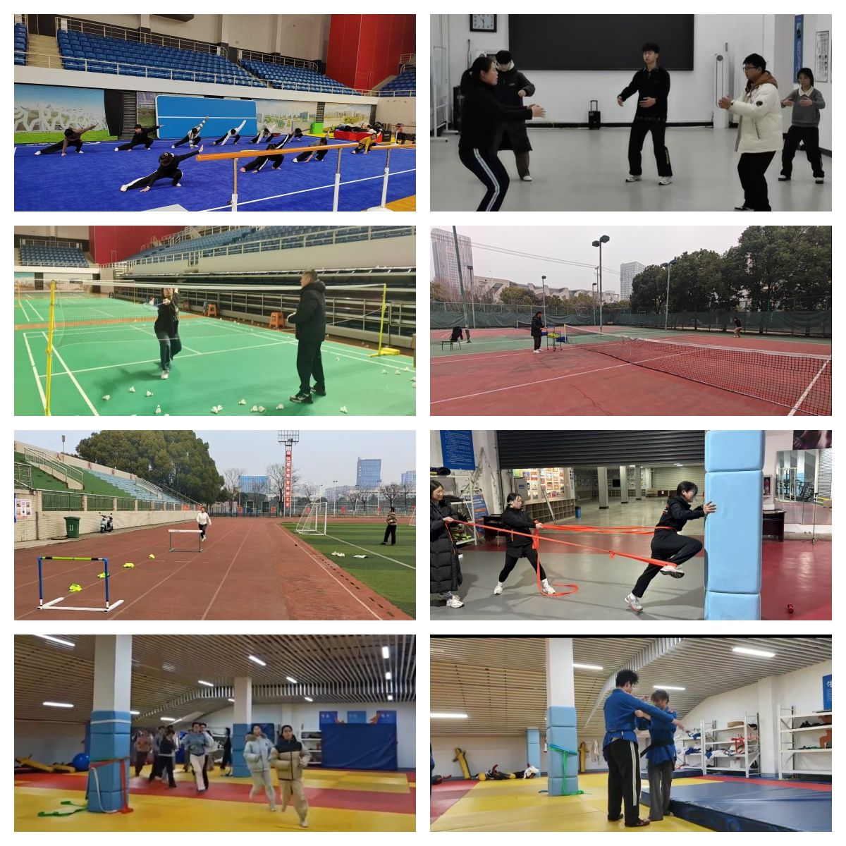武术队的训练场上,学生一招一式刚劲有力,动作行云流水,在反复练习中打磨套路的连贯性与观赏性,力求展现中华武术的磅礴气势;养生功队的学子们动作舒展柔和,呼吸与招式精准配合,在动静之间调养身心;羽毛球场上,羽拍翻飞,学生在快速奔跑、跳跃、挥拍中提升反应速度与攻防技巧,每一次精准扣杀都彰显着青春活力;田径场上,无论是短跑选手的爆发力训练,还是长跑选手的耐力比拼,学子们都咬紧牙关坚持到底,任凭汗水浸透衣衫,在寒风中书写着“更快、更高、更强”的追求。网球场内,学子们专注于每一次发球与回击,精准控制击球落点,在攻防转换中磨练战术思维;中国跤的训练场上,学子们两两结对,在力量对抗中学习技巧,摔倒了便立刻起身,拍拍尘土继续拼搏,脸上的汗水与笑容见证着坚韧与成长。