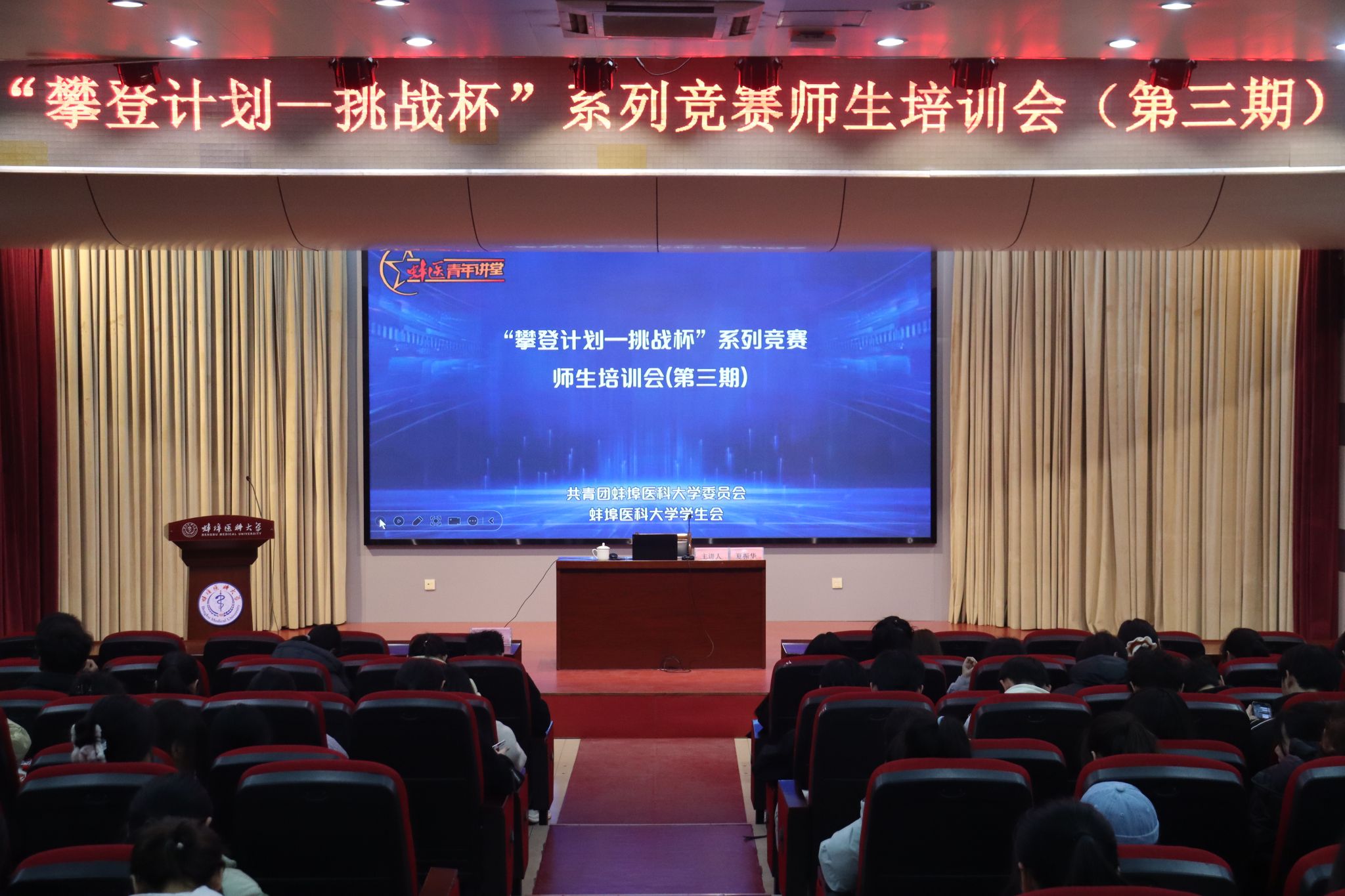 3月11日,校团委开启蚌医青年讲堂“攀登计划·挑战杯”系列竞赛师生培训会(第三期)活动,特邀中国科学技术大学、合肥工业大学硕士生导师夏振华老师担任主讲嘉宾,助力我校师生备战2026年度各项创新创业类系列竞赛、提升项目创新与选题能力。200余名师生参加活动。