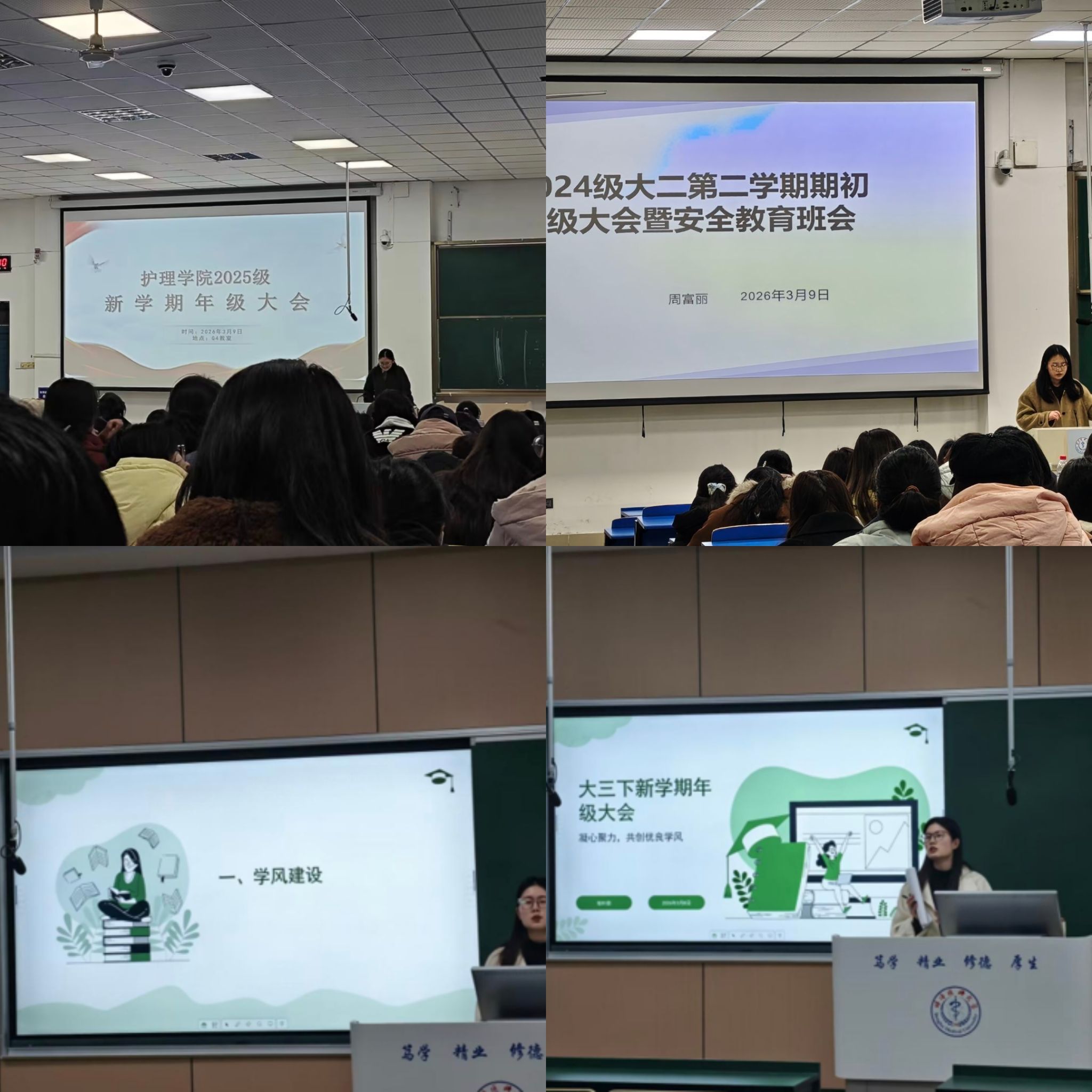 2023级年级大会则围绕学风建设、国防安全教育与征兵宣传、四六级备考、实习与考研规划四大主题进行部署。通过学业数据分析,强调端正学习态度、夯实专业基础;结合国防教育,鼓励符合条件的同学携笔从戎,将医者仁心与家国情怀相结合;针对即将面临的实习与考研,引导学生提前规划、合理定位,扎实推进个人发展。