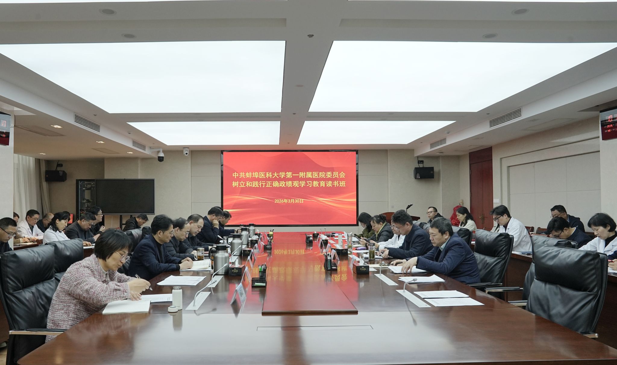 3月30日,第一附属医院举办树立和践行正确政绩观学习教育专题读书班,医院领导班子成员、各党总支、直属党支部书记及职能部门负责人参加学习。医院党委书记胡建国主持会议并作动员讲话。