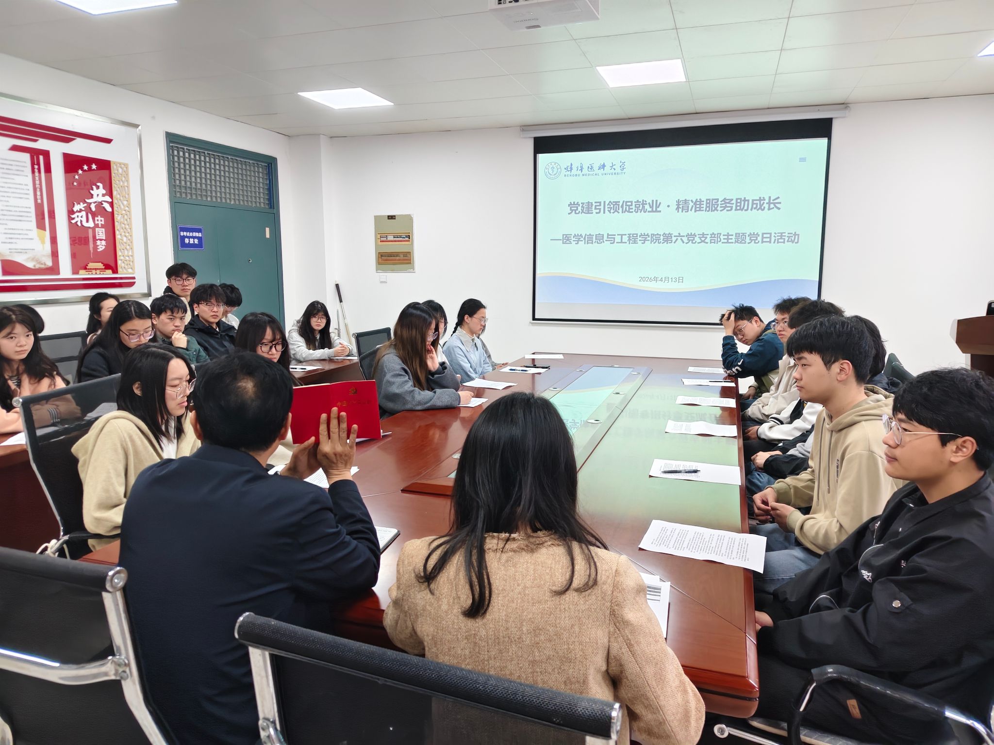 4月13日,医学信息与工程学院第六党支部举办“党建引领促就业,精准服务助成长”主题党日活动。学院党委副书记贾先果、第六党支部书记和支部全体党员参与活动。