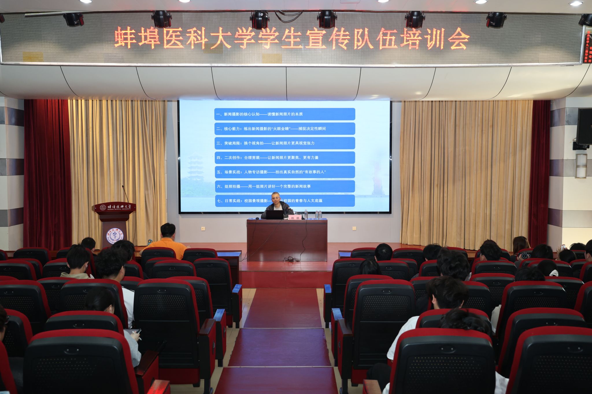 4月18日下午,党委宣传部举办学生宣传队伍培训会,特邀蚌埠市新闻传媒中心网络编辑部郎震老师来校授课。宣传部党支部教师党员,校融媒体中心、广播站、共青团新媒体及各学院新媒体团队的200余名学生骨干参加培训。