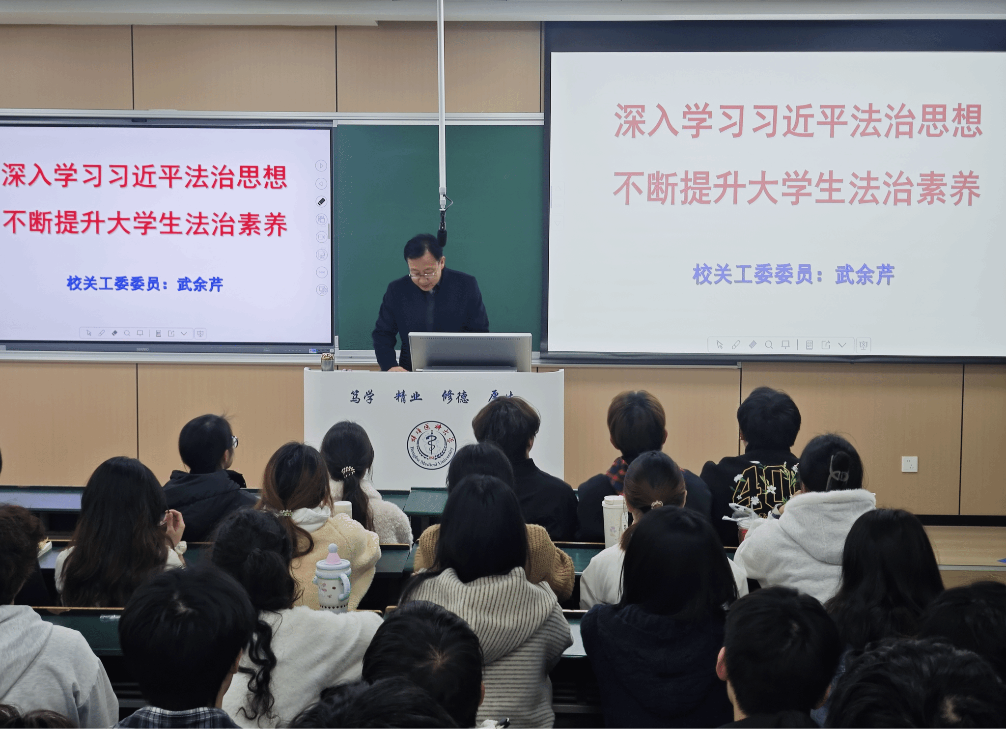 讲座中,武余芹围绕习近平法治思想的形成与发展、主要内容以及提升大学生法治素养三部分内容,系统阐释了全面依法治国的重大意义与科学内涵;引导同学们将法治思维融入学习与生活,恪守行为底线,切实提升自身法治素养。