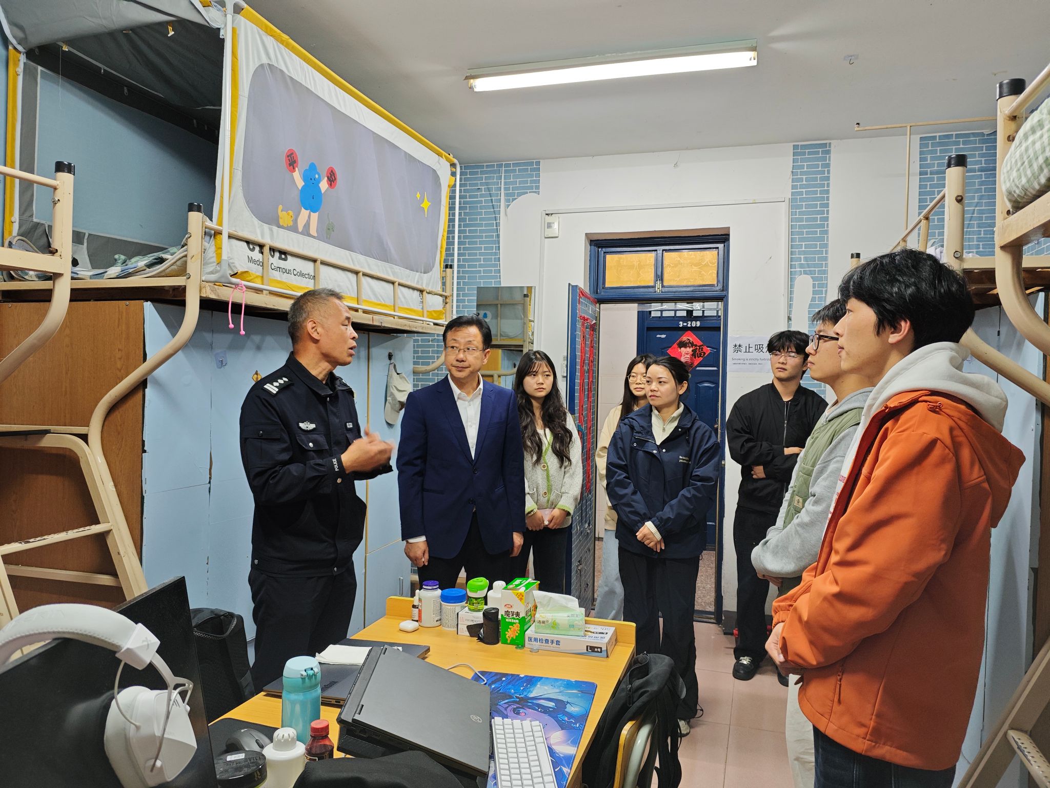本次活动紧扣毕业季安全管理和校园反诈工作重点,专项开展毕业生求职离校安全教育,将法治宣传、反诈教育、暖心走访下沉至学生宿舍,切实筑牢校园安全稳定防线。活动中,陈兴武、王之高结合近期校园电信网络诈骗、求职就业诈骗典型案例,细致讲解诈骗识别技巧、个人信息保护要点及毕业求职风险防范策略。走访小组还深入其他年级宿舍,面对面开展反诈法治宣讲,同步排查宿舍安全隐患。学生党员主动亮身份、作表率,带头学习反诈知识、宣传安全知识,带动身边同学提升防范意识和自我保护能力。