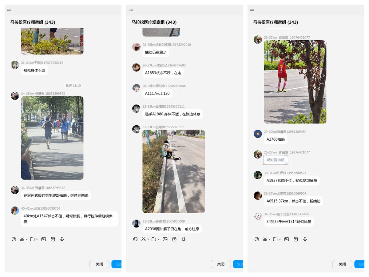 在医疗观察岗位上,每100米驻守1名志愿者,观察参赛选手的状态,做好医疗观察和应急处置,协助专业医护人员开展保障工作;收容车辆岗位上,志愿者配合医务人员为体力不支选手提供医疗护理、能量补给及心理安抚;赛道计时岗位上,志愿者认真摆放计打卡器,提醒选手顺利通过计时点;赛道分流与路口指引岗位上,志愿者文明引导比赛路线、维护现场秩序,助力赛事高效开展。