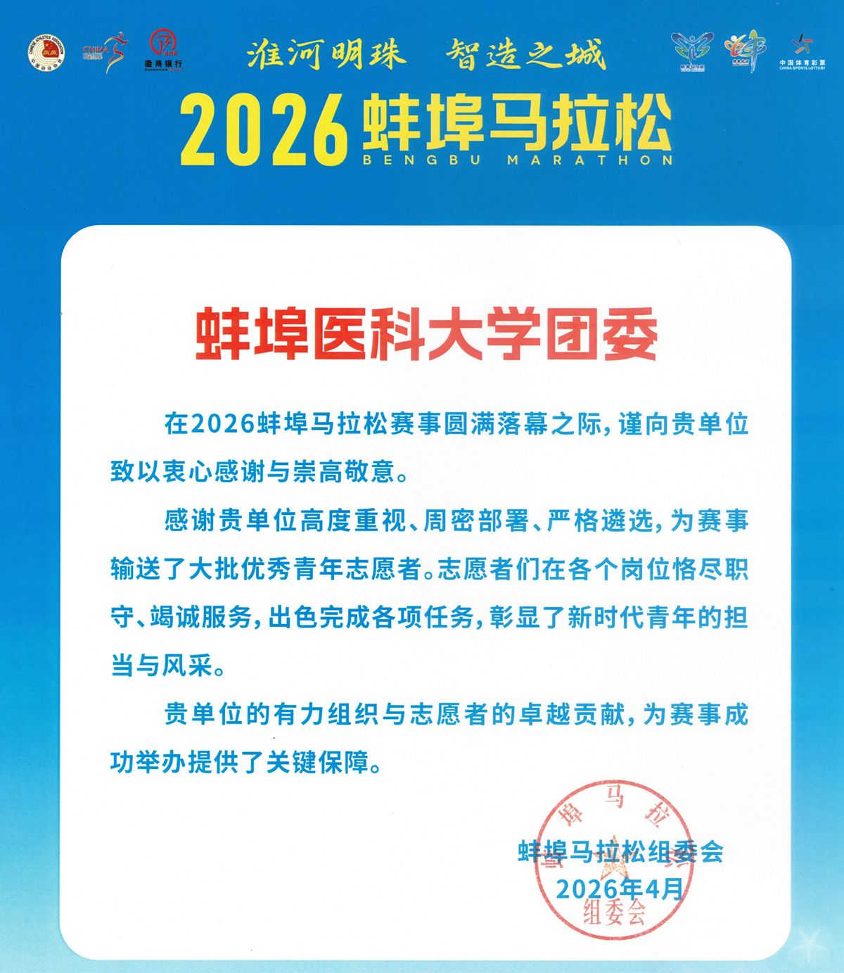 近10个小时的高强度志愿服务,志愿者们不畏辛劳、默默奉献,以饱满热情和严谨态度圆满完成任务,在擦亮蚌埠城市名片的品牌活动中,展现了蚌医青年志愿服务的靓丽风景线,赢得社会各界广泛赞誉,蚌埠马拉松组委会为此专门向校团委发来感谢信。